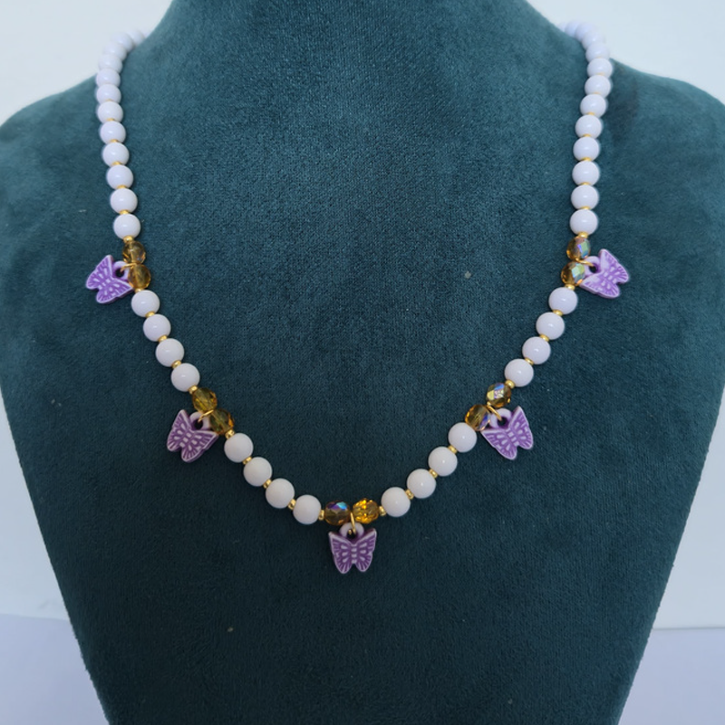 Collar Mariposa – perlas acrilicas con 5 dijes acrilico morado