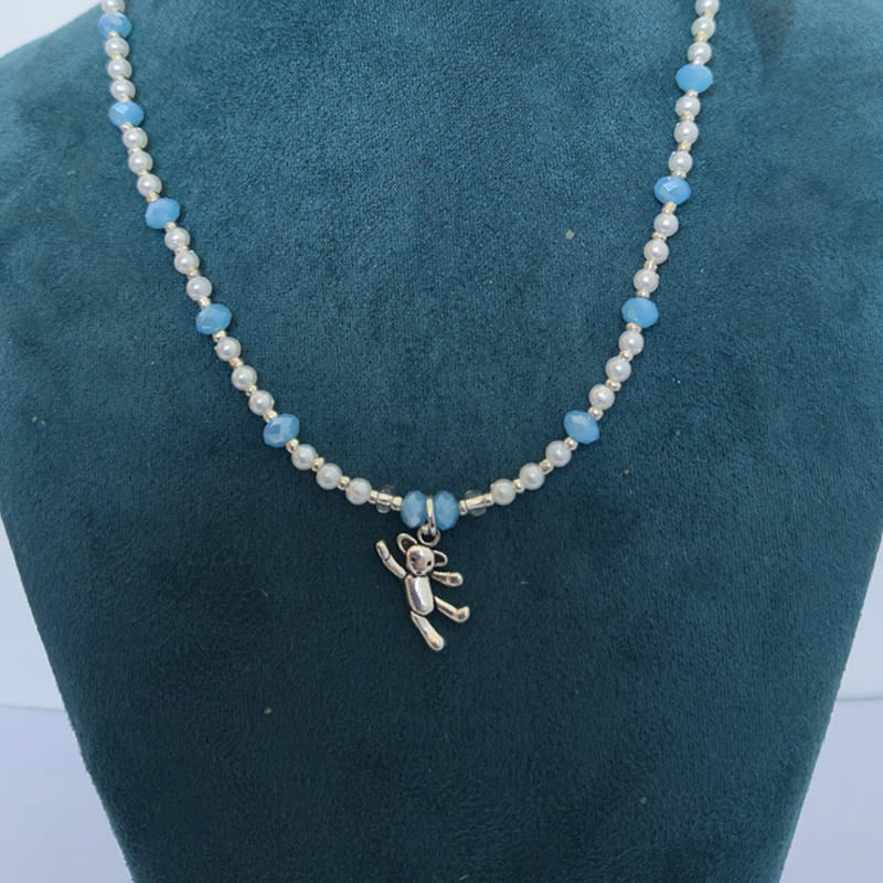 / Collar Osito – Perlas con cristales celeste y dije pewter